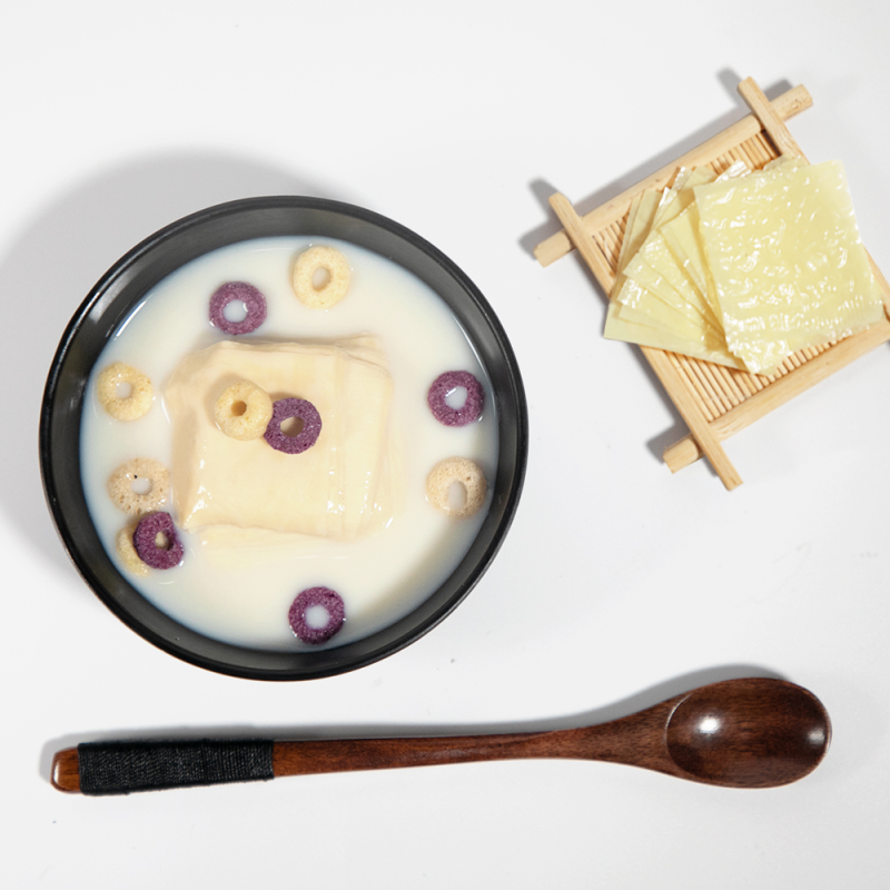 蛋白質含量高,融于豆乳中,口感細膩醇滑,豆香濃郁。湯葉為豆漿煮制凝結而成的豆皮,豆乳湯葉鍋。